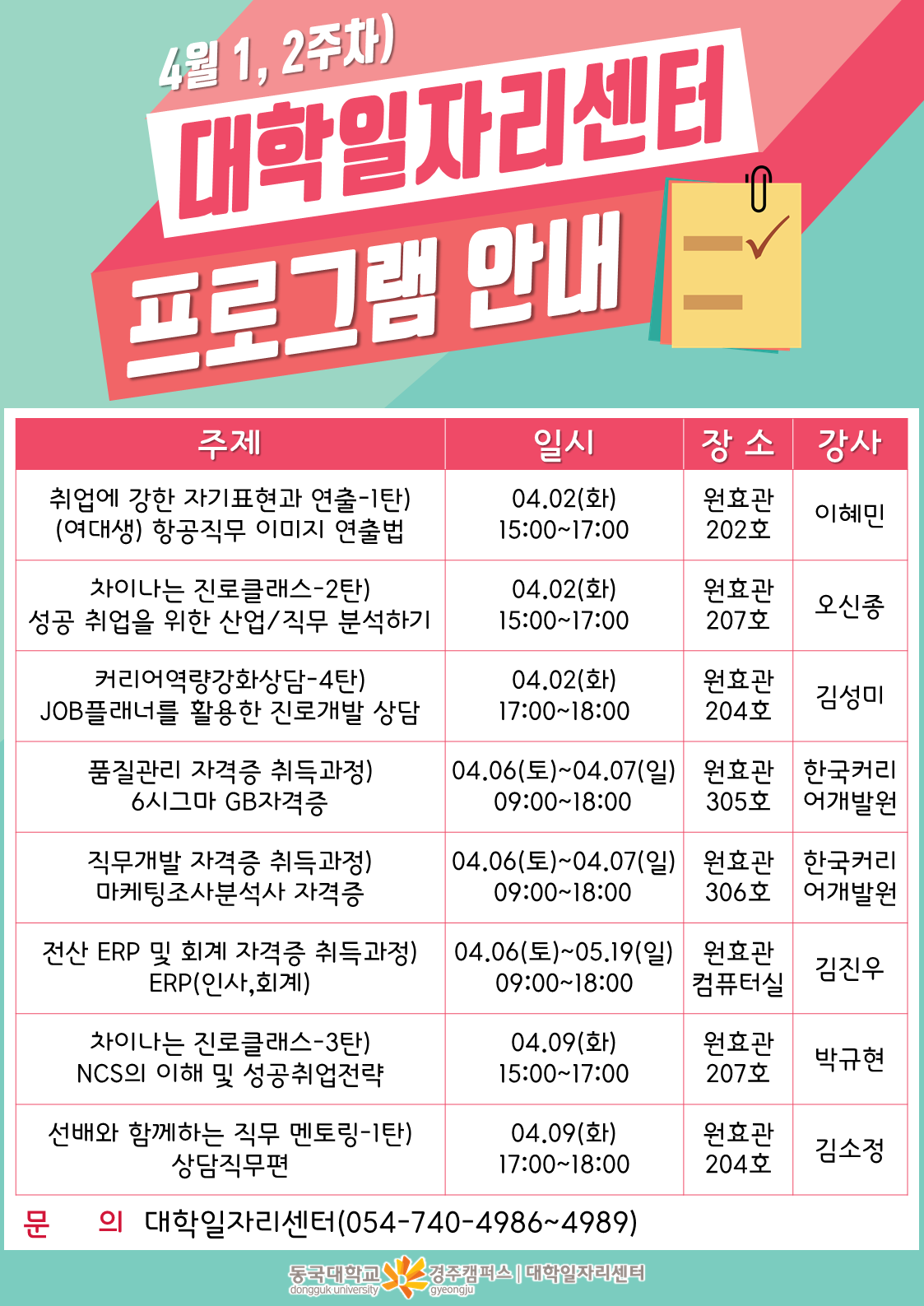 [대학일자리센터] 4월 1, 2주차) 대학일자리센터 프로그램 안내