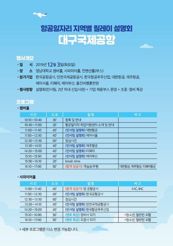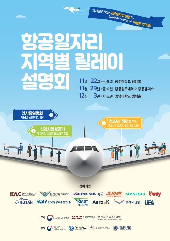 12월 3일(화) 영남대학교에서 열리는 '항공일자리 지역별 릴레이 설명회' 현장참가자를 모집합니다.