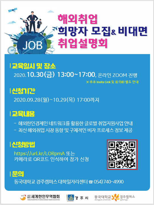<세계한인무역협회(World-OKTA)-경주시-동국대학교 대학일자리센터> 공동 주최하는 해외취업 희망자 모집 및 비대면 온라인 취업 설명회를 아래와 같이 개최합니다.