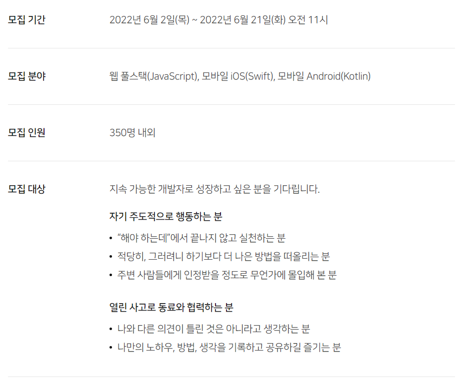 ■ 모집 분야 : 웹 풀스택(JavaScript), 모바일 iOS(Swift), 모바일 Android(Kotlin)