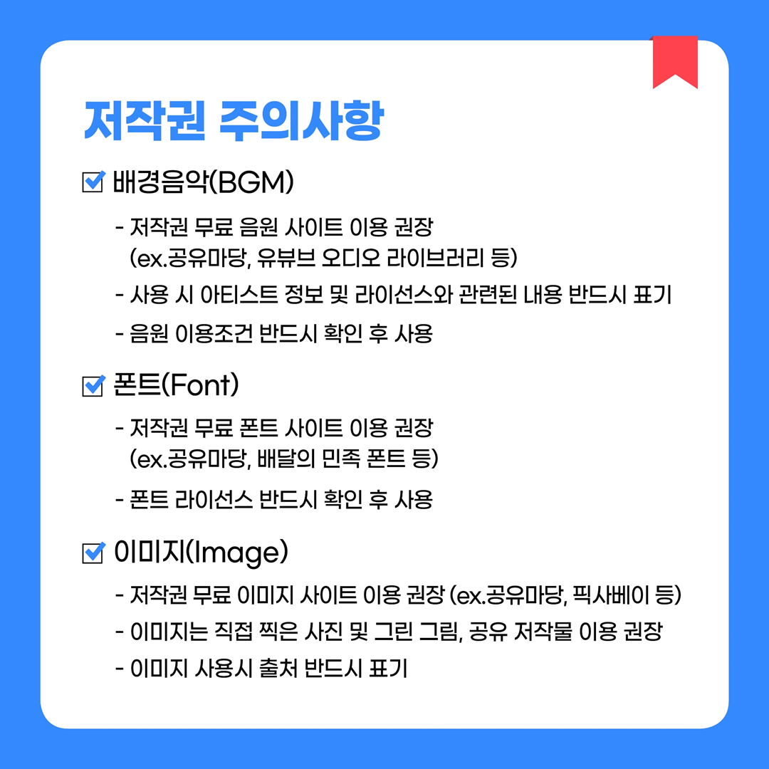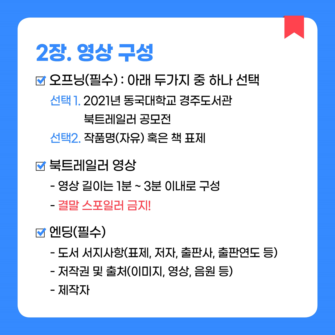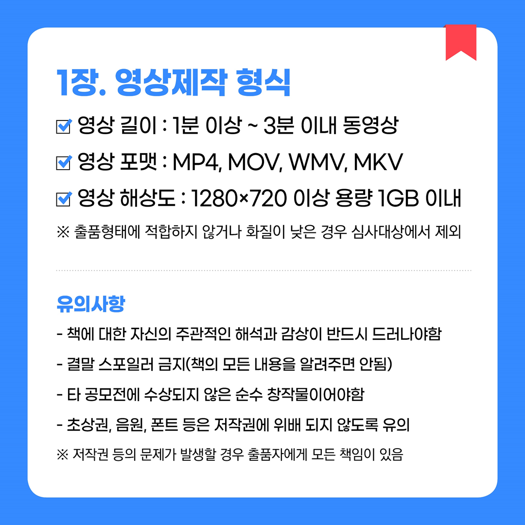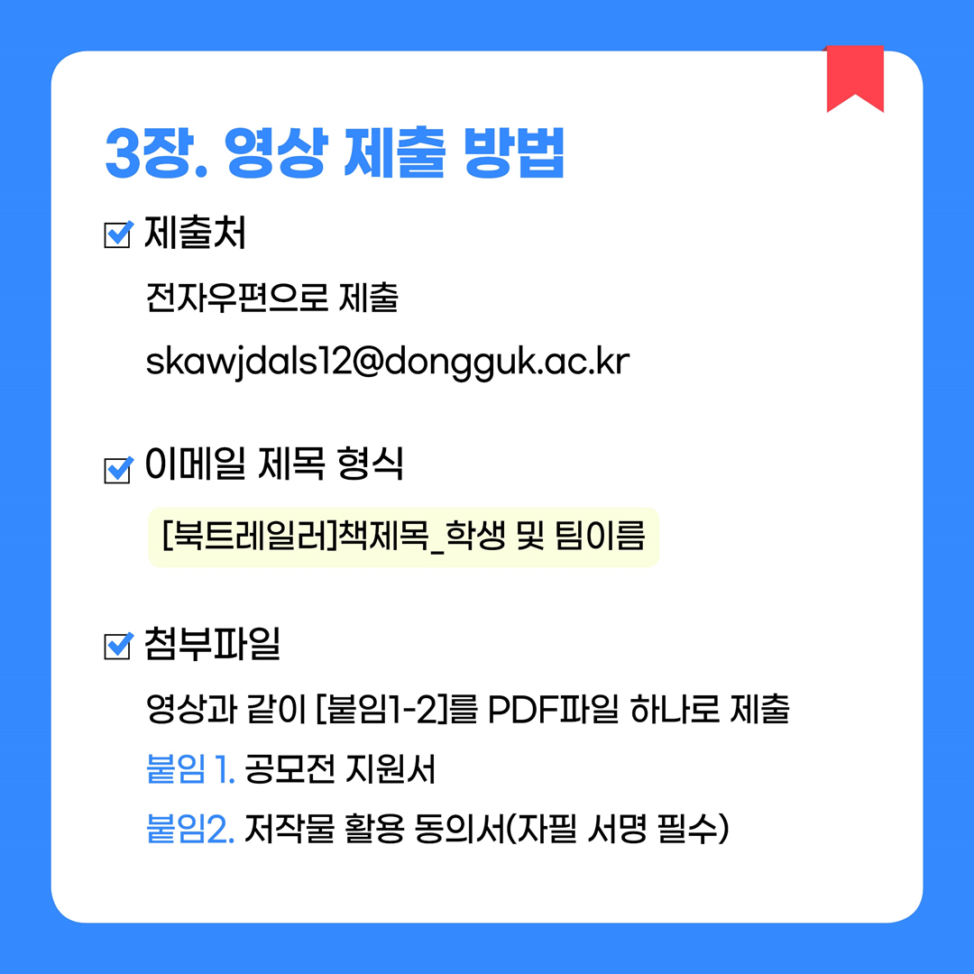 6. 제출자료 : 북트레일러 영상물 1부, 지원서 및 저작물 활용동의서 각 1부 (※ 자필 서명 필수)