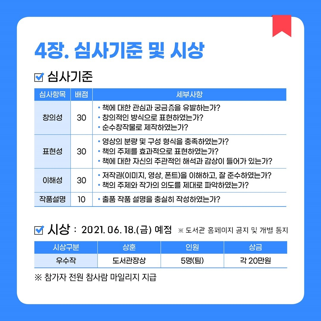 7. 수상자 발표 : 2021. 6. 18(금)예정 ※도서관 홈페이지 및 개별통보