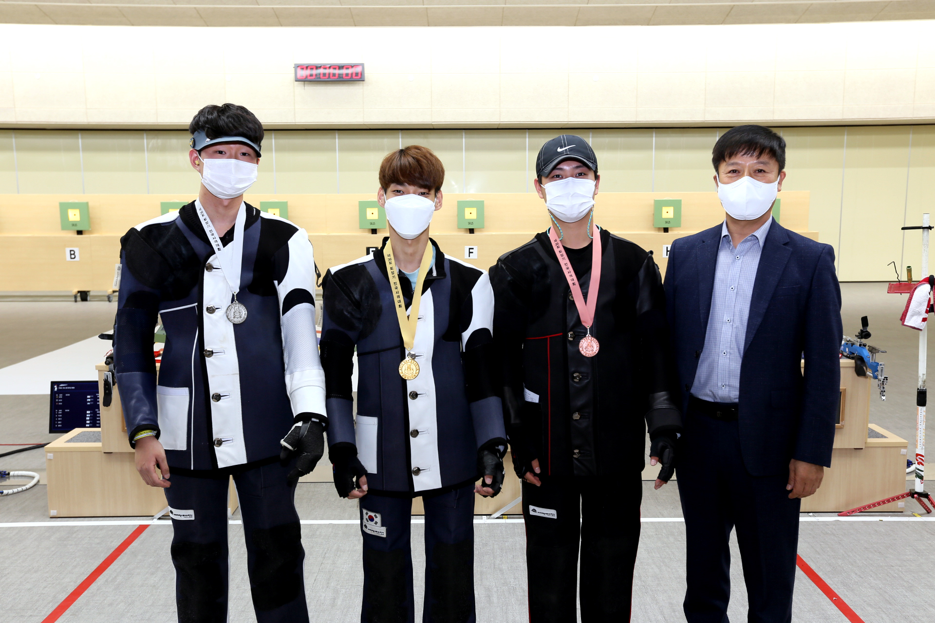 <좌측부터 송민호(인천대,은메달), 남태윤(동국대,금메달), 전찬희(경남대,동메달), 김태호 동국대 사격부 감독>
