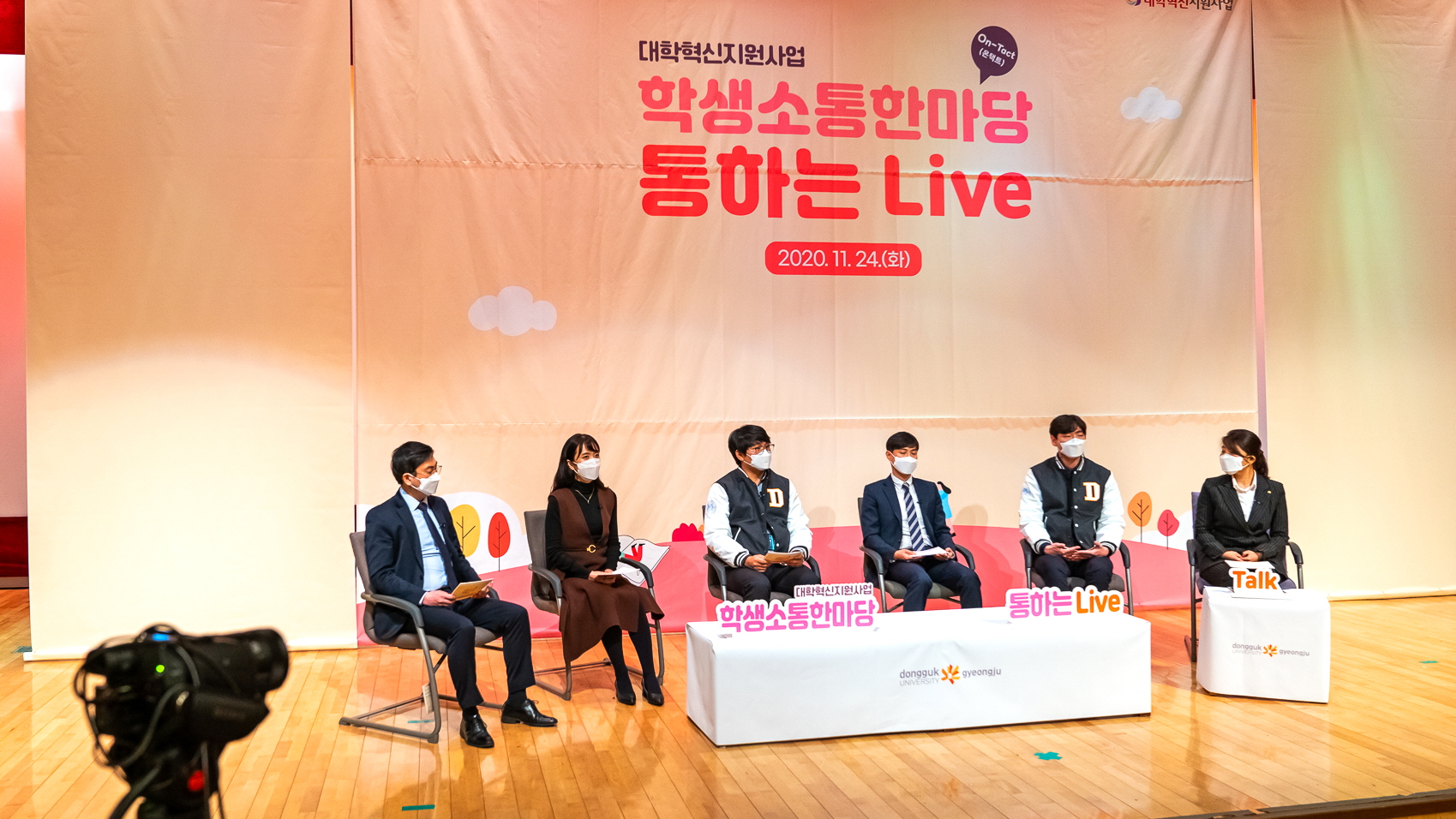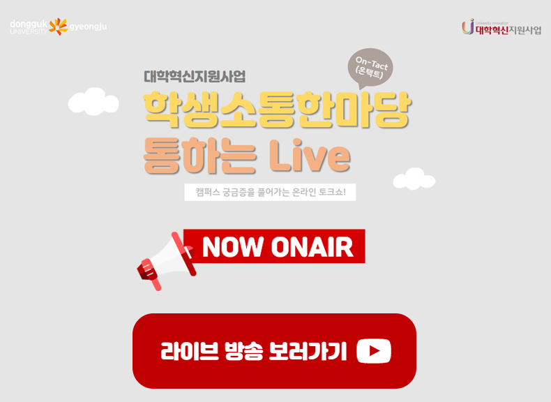 ▲‘통하는 라이브’는 유튜브 채널을 이용한 실시간 온라인 토크쇼로서 대학혁신사업과 등록금, 장학금, 학생복지 등에 관하여 사전에 학생들이 문의한 질문은 물론 온라인 채팅을 통한 질문들을 담당자들이 실시간으로 답변했다. 행사에 참여하지 못한 학생들은 별도 개설된 전용 홈페이지를 통해 녹화분을 상시 시청할 수 있다.