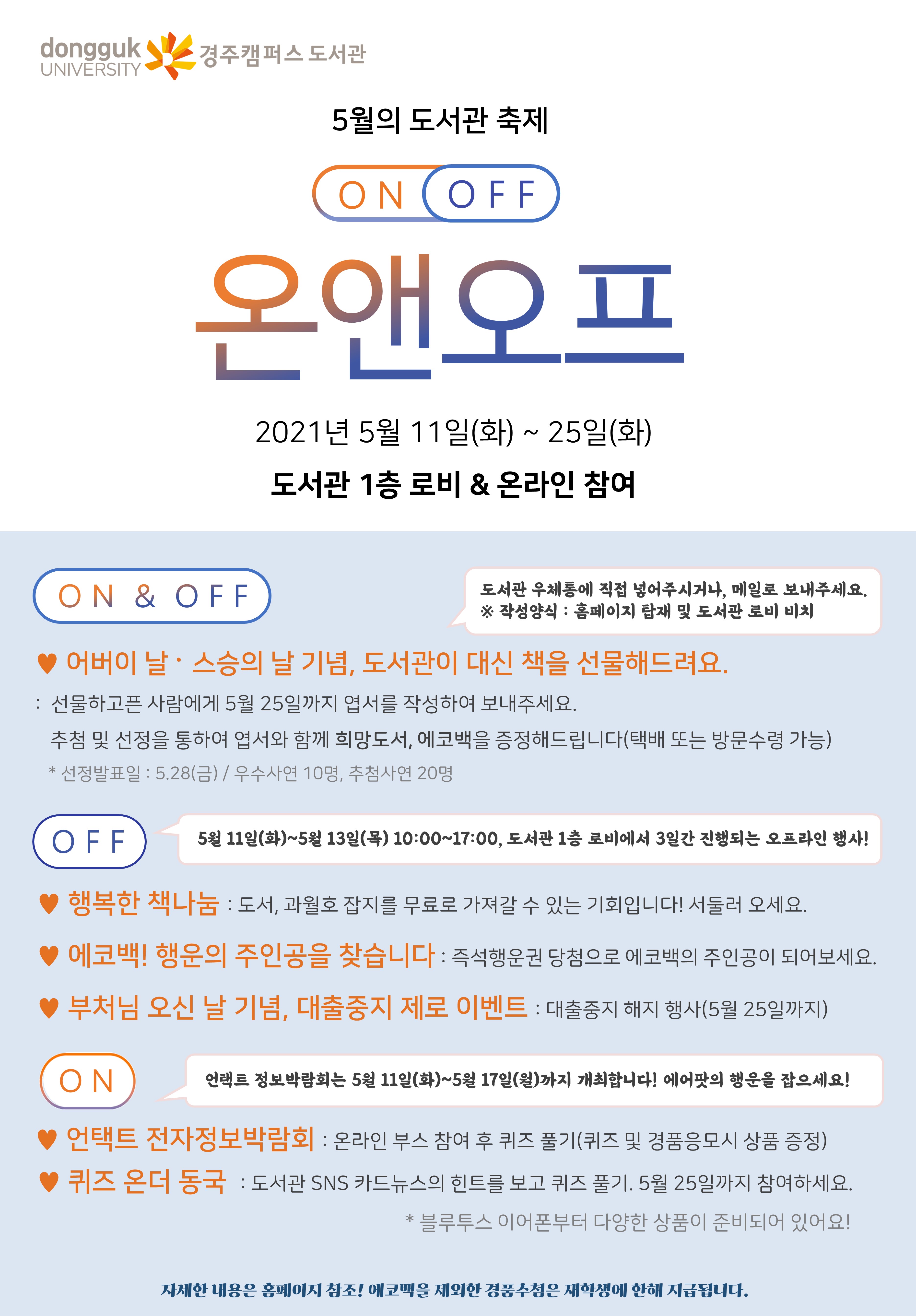 도서관은 5월 ‘감사의 달’을 맞아 재학생을 대상으로 ‘2021 도서관 온앤오프’행사를 개최한다.