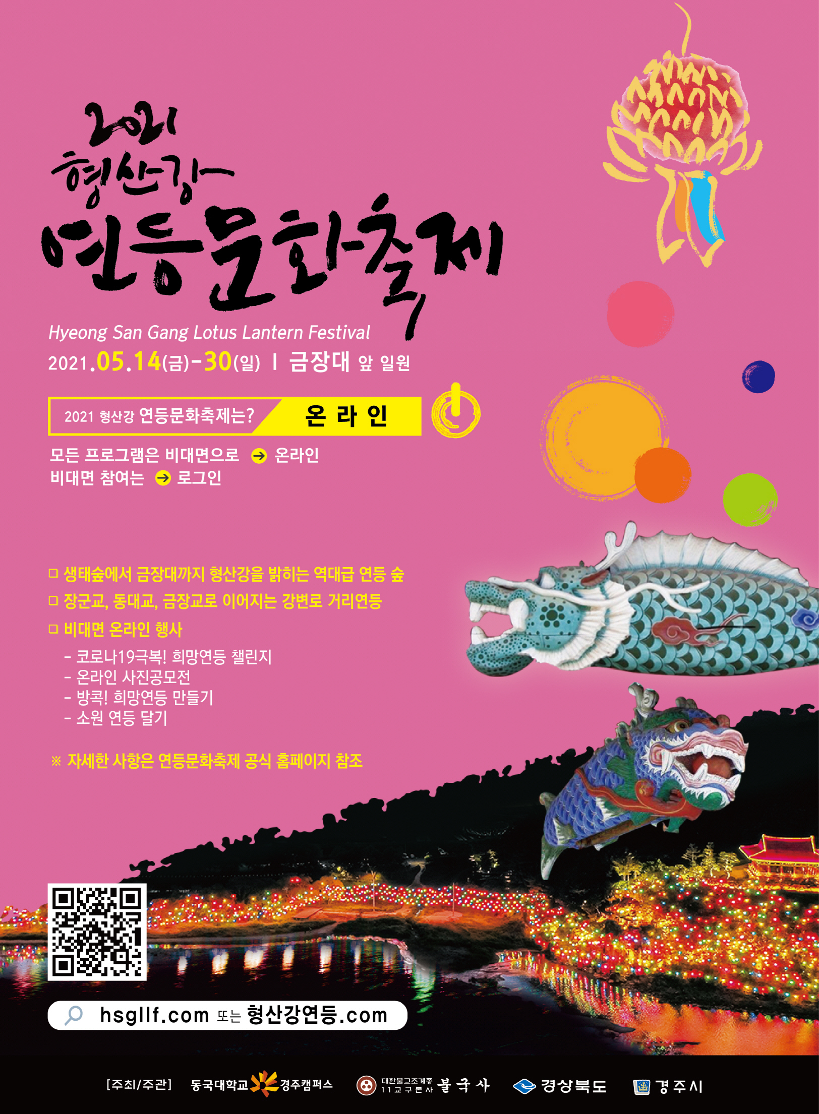 동국대 경주캠퍼스가 5월 14일, 연등 숲 불을 밝히는 것으로 시작하여 오는 30일까지 금장대 앞 일원에서 2021 형산강 연등문화축제를 개최하고 있다.