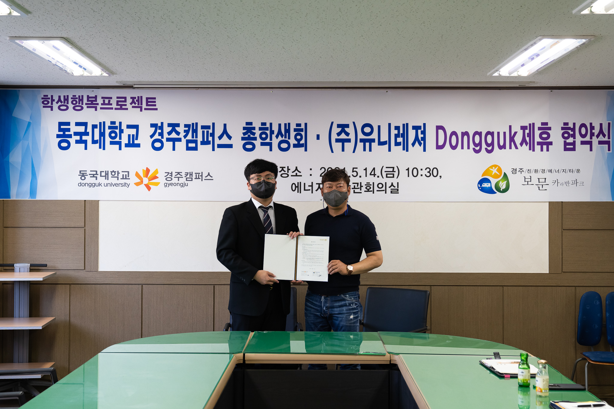 동국대 경주캠퍼스 총학생회가 지난 14일 교내 에너지공학관 강의실에서 ㈜유니레저와 제휴 협약을 체결했다.