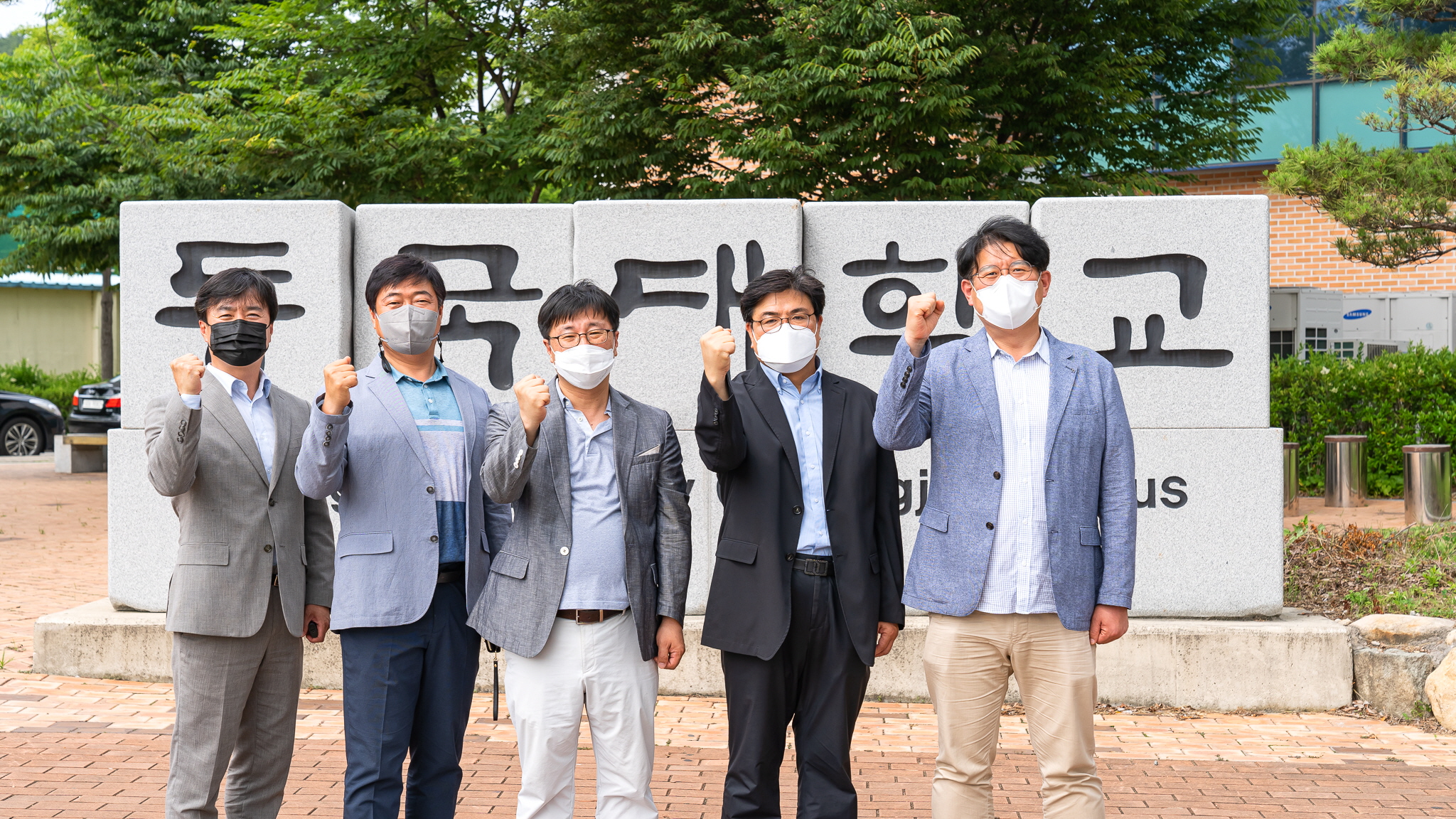 <왼쪽부터 산학협력단 산학협력팀 신승우 과장, 임명수 팀장, 산학협력단 전동협 단장, 한창용 교수, 박성범 교수>