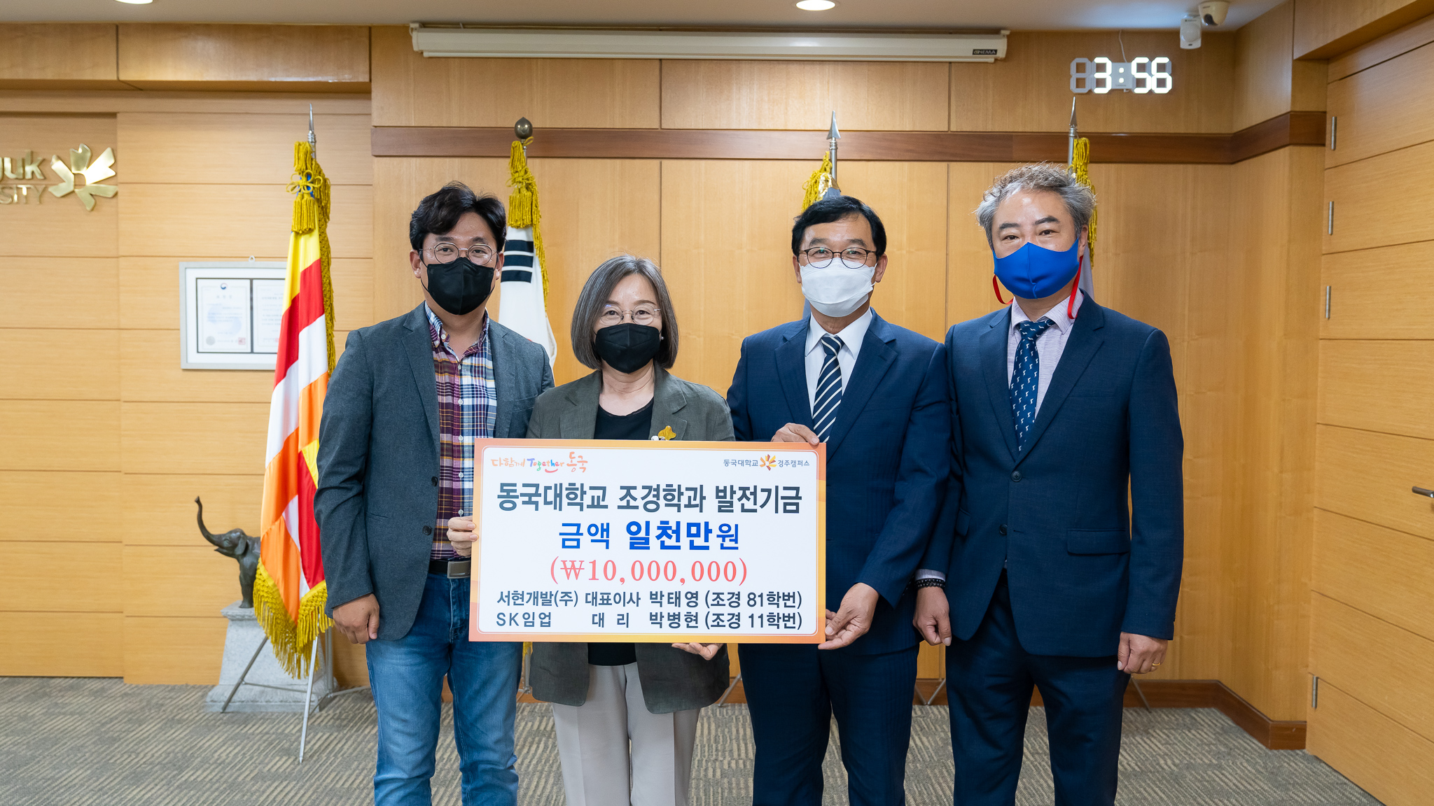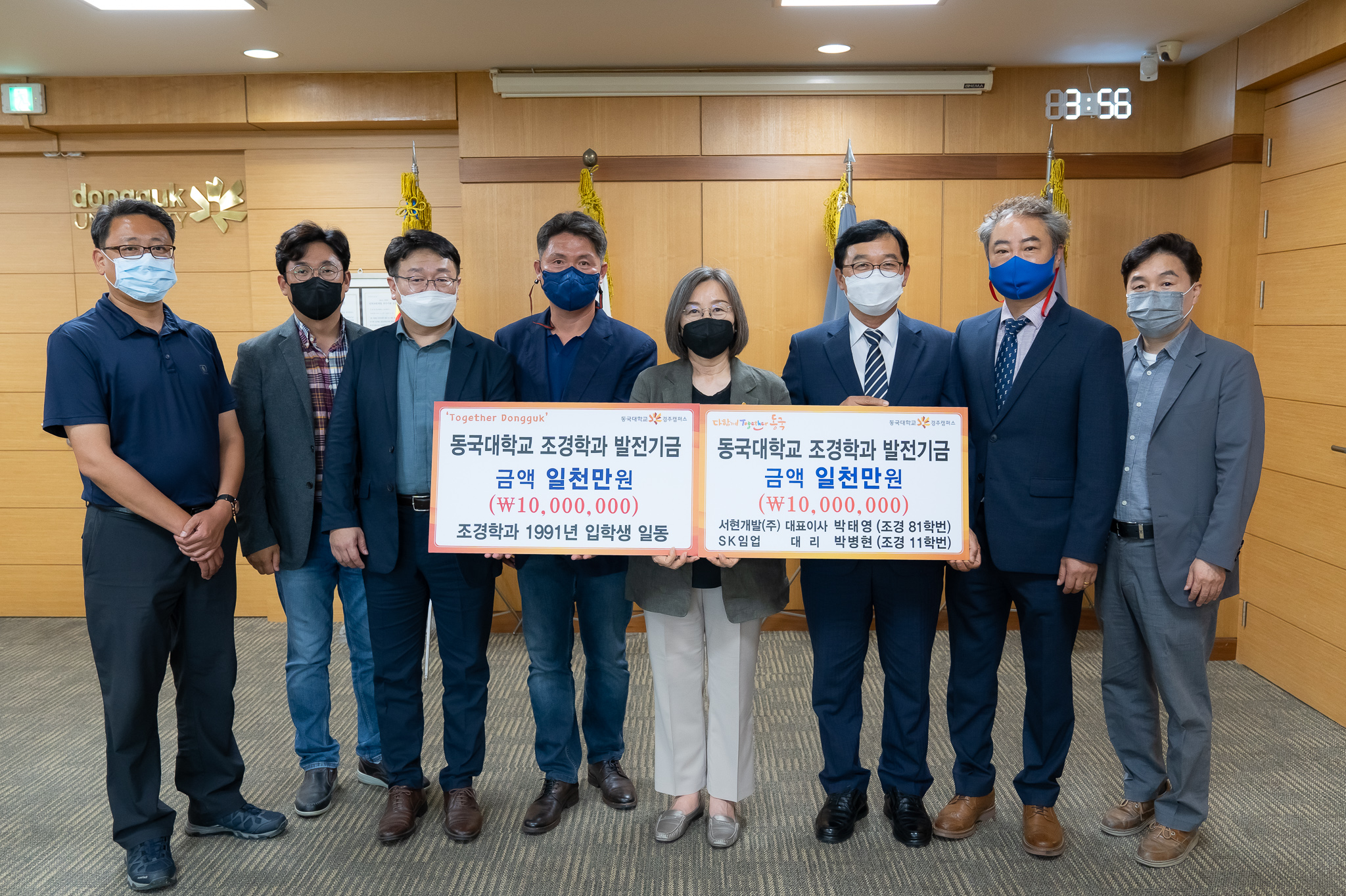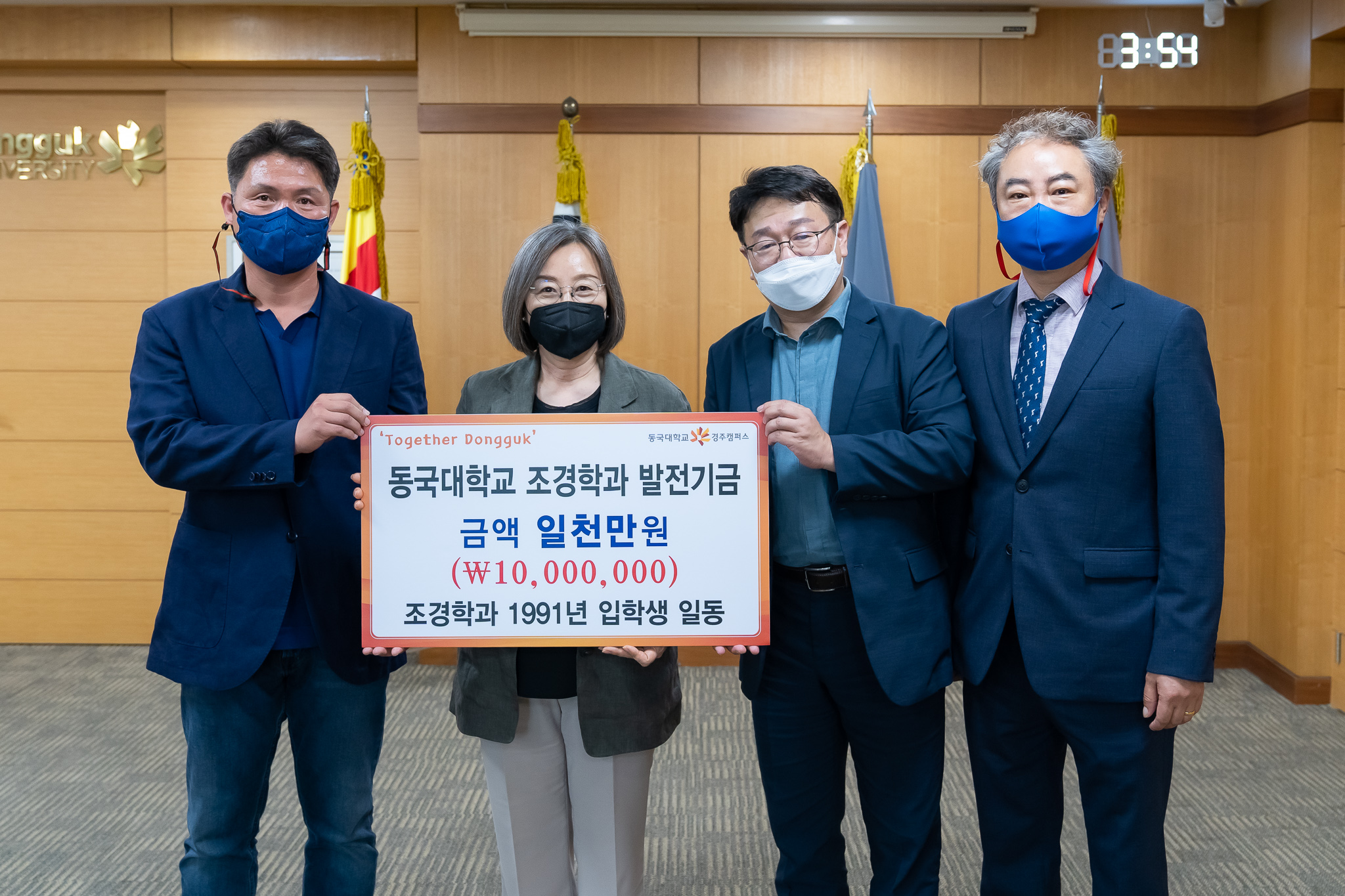 지난 18일 오후 4시 백주년기념관 화백홀에서 올해 입학 30주년을 맞은 동국대 경주캠퍼스 조경학과 91학번 동기일동이 학과발전기금 1천만 원을 이영경 동국대 경주캠퍼스총장에게 전달했다.
