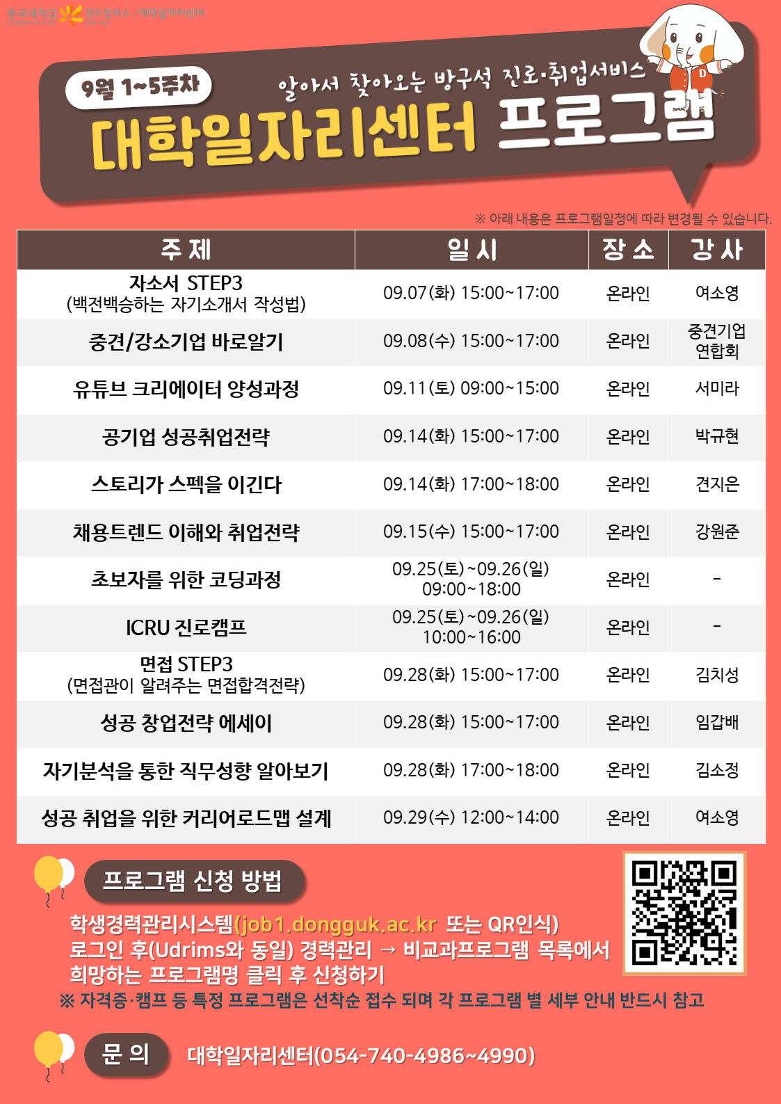동국대 경주캠퍼스 대학 일자리 센터는 지난 1학기에도 비대면 온라인 특강 프로그램을 진행하여 6,000명이 넘는 학생들에게 취업에 필요한 특강을 온라인으로 진행한 바 있다.