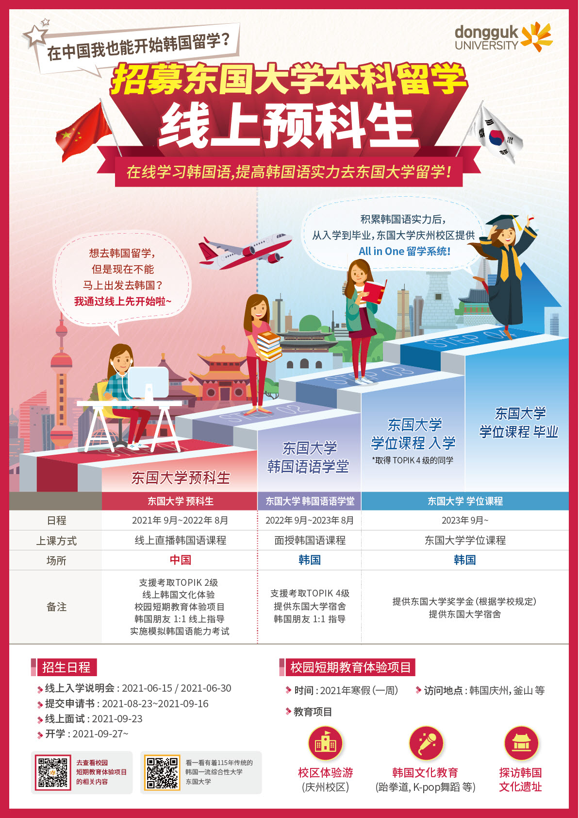 특히 학생들의 한국어 학습 능력 향상과 학위과정 입학을 목표로 한국요리 만들기, K-POP 댄스 배우기 등 온라인 한국문화 체험수업과 한-중 학생 간 1:1 언어교환 프로그램인 동국 프렌즈를 운영하고, 방학 중 단기방문을 통해 한국어 집중 연수, 한국 문화탐방 프로그램과 유학 설명회를 개최한다.