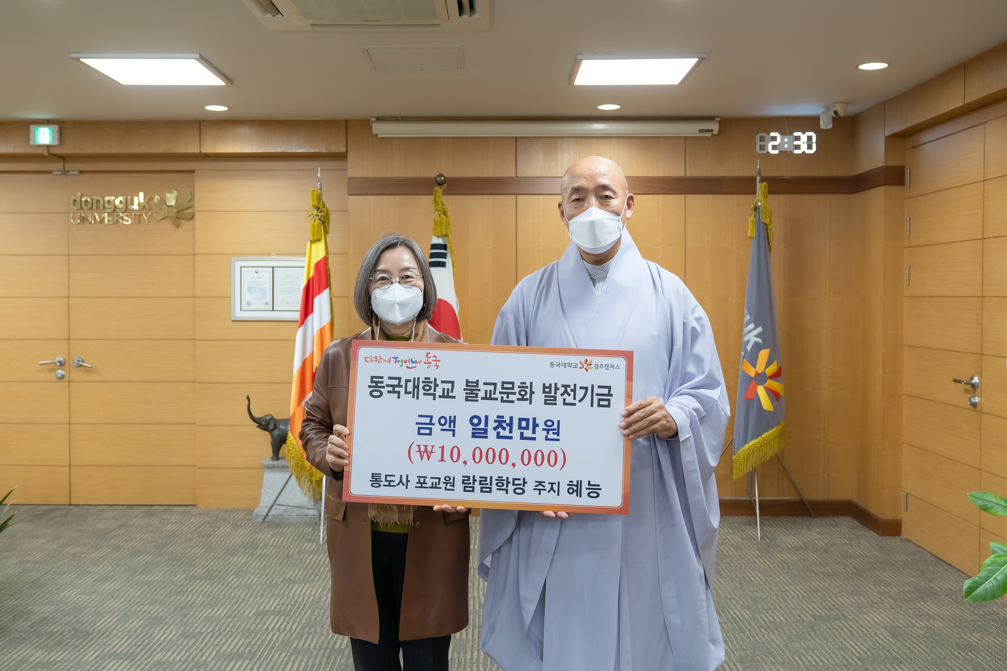 영축총림 통도사 포교원 람림학당 주지 혜능스님이 지난 15일 동국대 경주캠퍼스 백주년기념관 화백홀에서 동국대 경주캠퍼스 불교문화발전 기금으로 1천만 원을 전달했다.