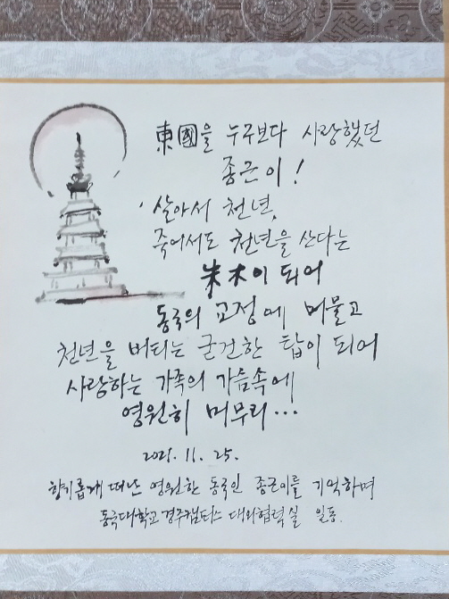 동국대 경주캠퍼스는 교정에 추모 나무와 추모석을 조성하고 고인이 재학 중 공부하던 진흥관에 종근라운지를 설치하여 평소 학교를 좋아했던 고인을 기념하고 있다.