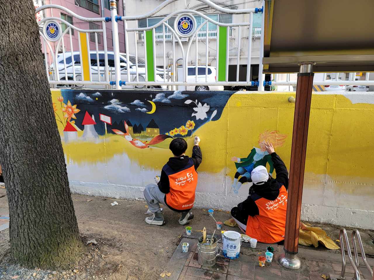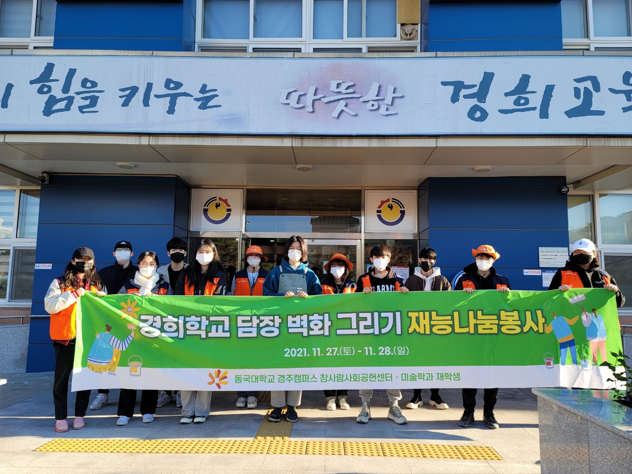 동국대학교 경주캠퍼스 인재개발처(처장 김억조) 참사람사회공헌센터는 지난 11월 27일부터 28일까지 이틀간 경주 동천시 소재 경희학교(교장 강호철)를 방문해 담장 벽화그리기 재능나눔 봉사활동을 펼쳤다.